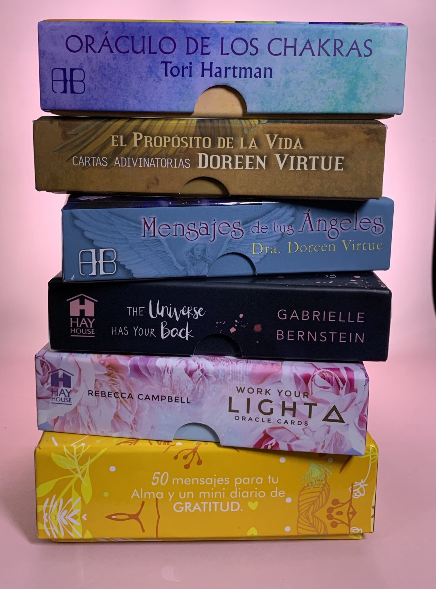 Cartas/Deck: Pensamientos del corazón de Louise Hay, mensajes del universo de Andrea Agudelo, cartas de las herramientas del amor de The loving Journal, cartas gracias, gracias, gracias de Valentina Gaviria
